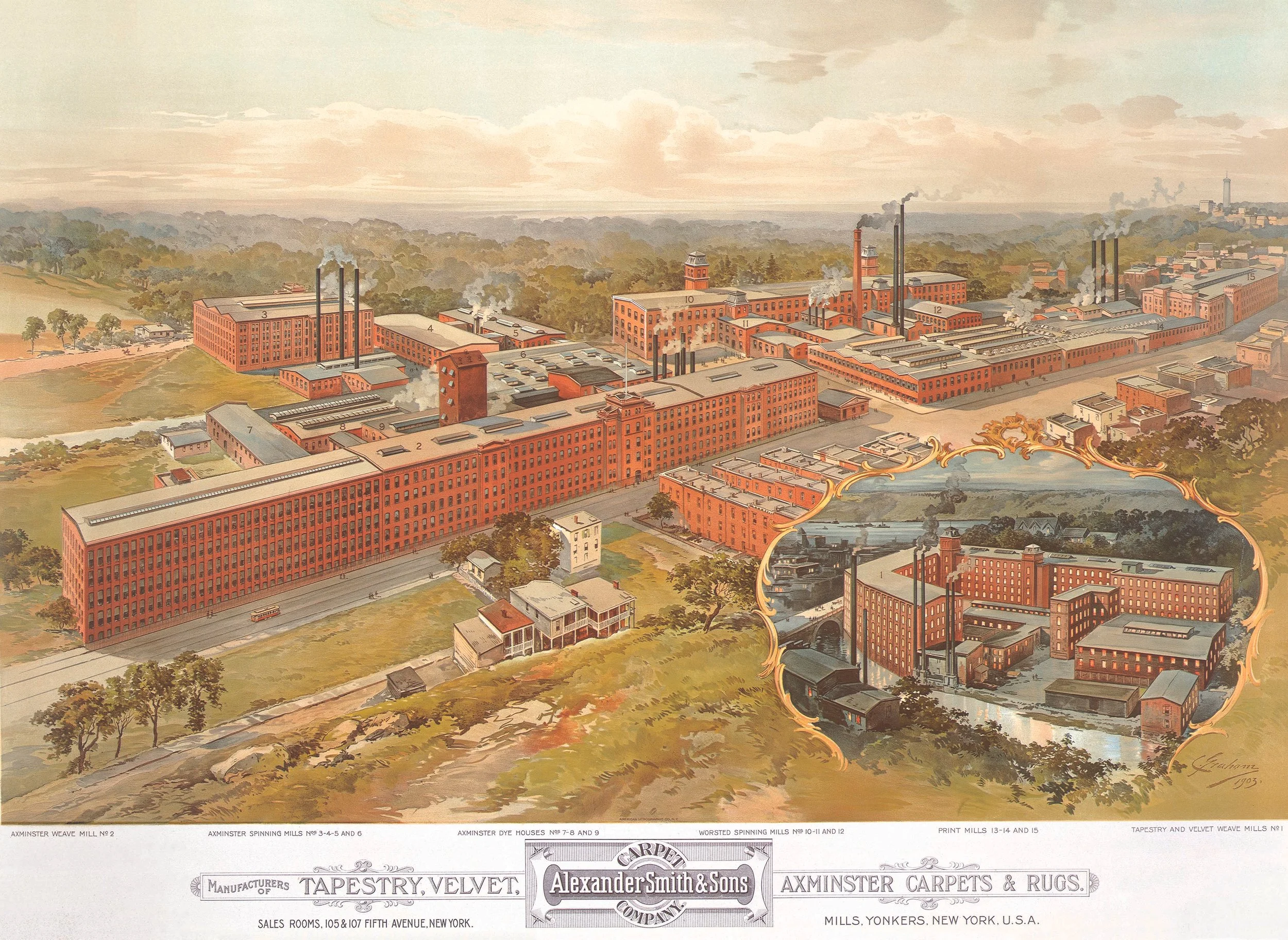 In 1873, when the selling agency of Alexander Smith & Sons Carpet Company was transferred to W. & J. Sloane, Law became the agency’s manager. An early stockholder in the Smith company, he moved his family—by now a wife, three sons, and four daughters—to Yonkers, New York, where the factory was located. Within just one year of the relocation, Alexander Smith’s son, Warren, reported that the factory made more profits than any other business in Yonkers. The carpet industry quickly became the city’s economic backbone, employing thousands of residents over the next few decades. Many workers referred to the company as “just like a family,” and although the factory relocated in 1954, an 87-year-old former employee later stated that, “I’d be working there yet, if the shop were there.” The mill also often employed residents who followed Law’s own, Calvinist ideas that success was hard-earned and a sign of God's graciousness. The Smith company eventually became a leading rug company internationally, with Walter Law sitting on its board. 6, 7.